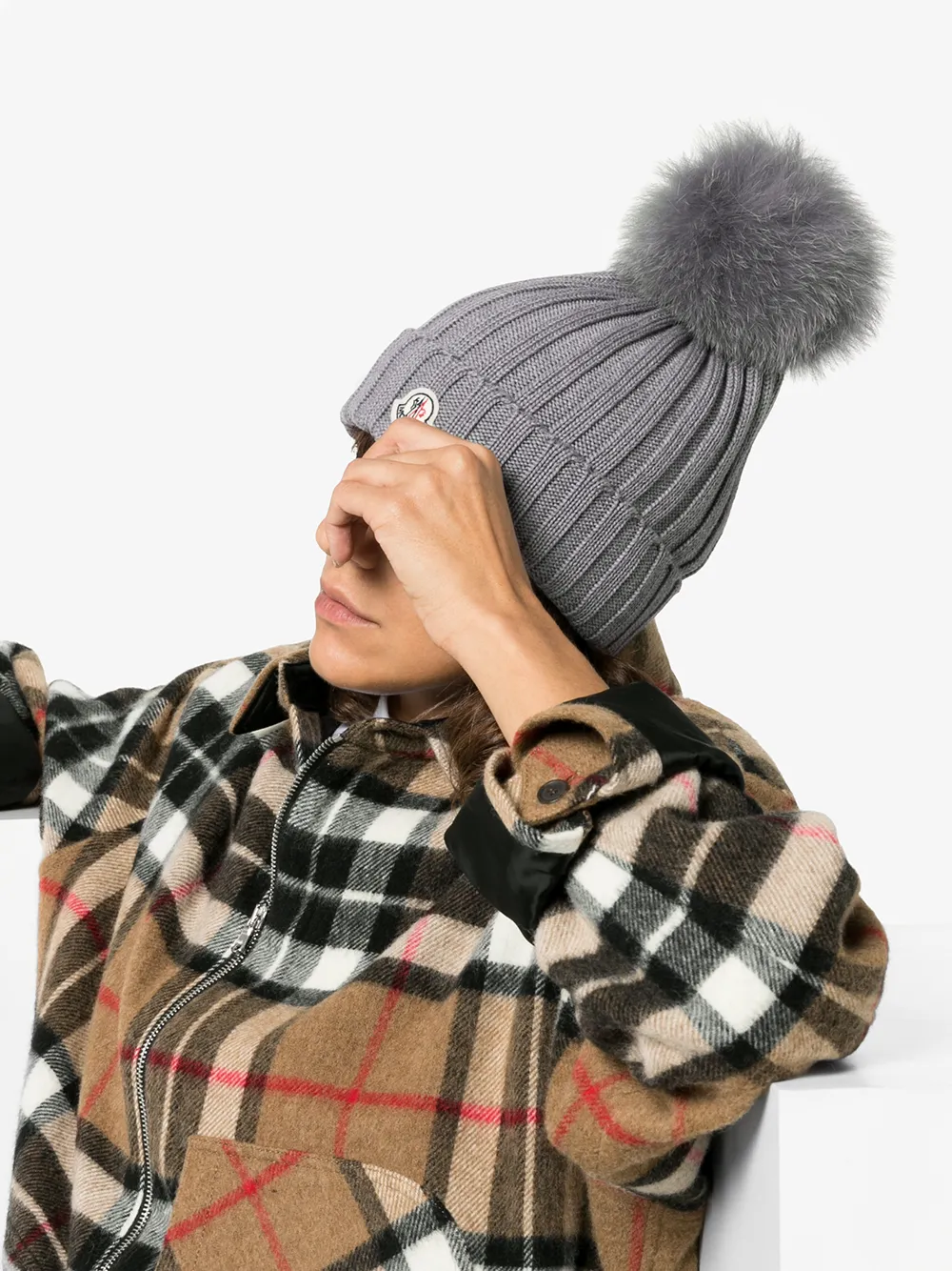 Moncler Grey wool beanie hat with pom pom