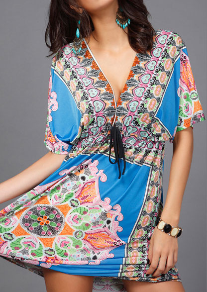 Printed Deep V-Neck Mini Dress